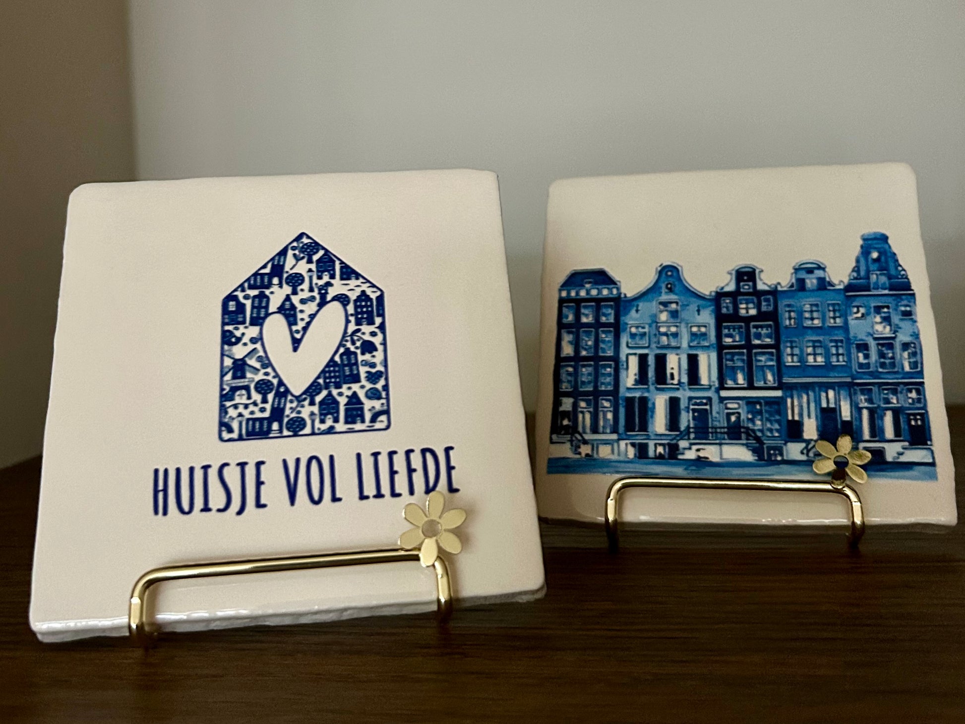 Keramieken tegel met Delfts blauwe huisje vol liefde.
