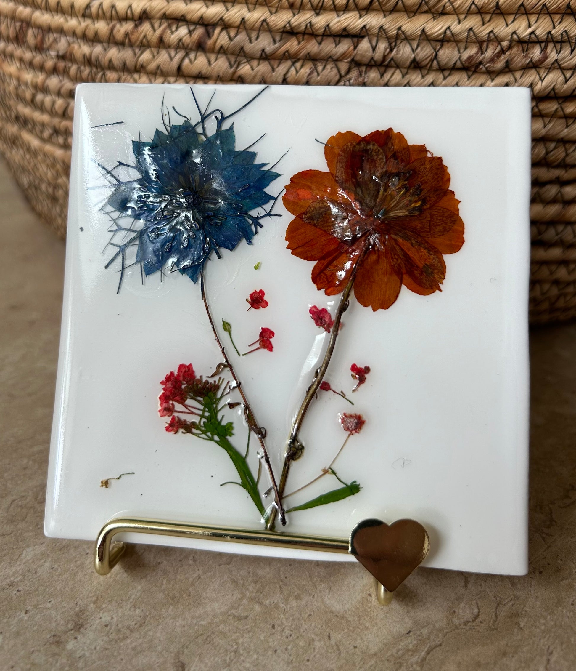 Handgemaakte tegel met echte droogbloemen. Elke tegel is uniek! Super leuk om neer te zetten of op te hangen in huis. Perfect om cadeau te doen.