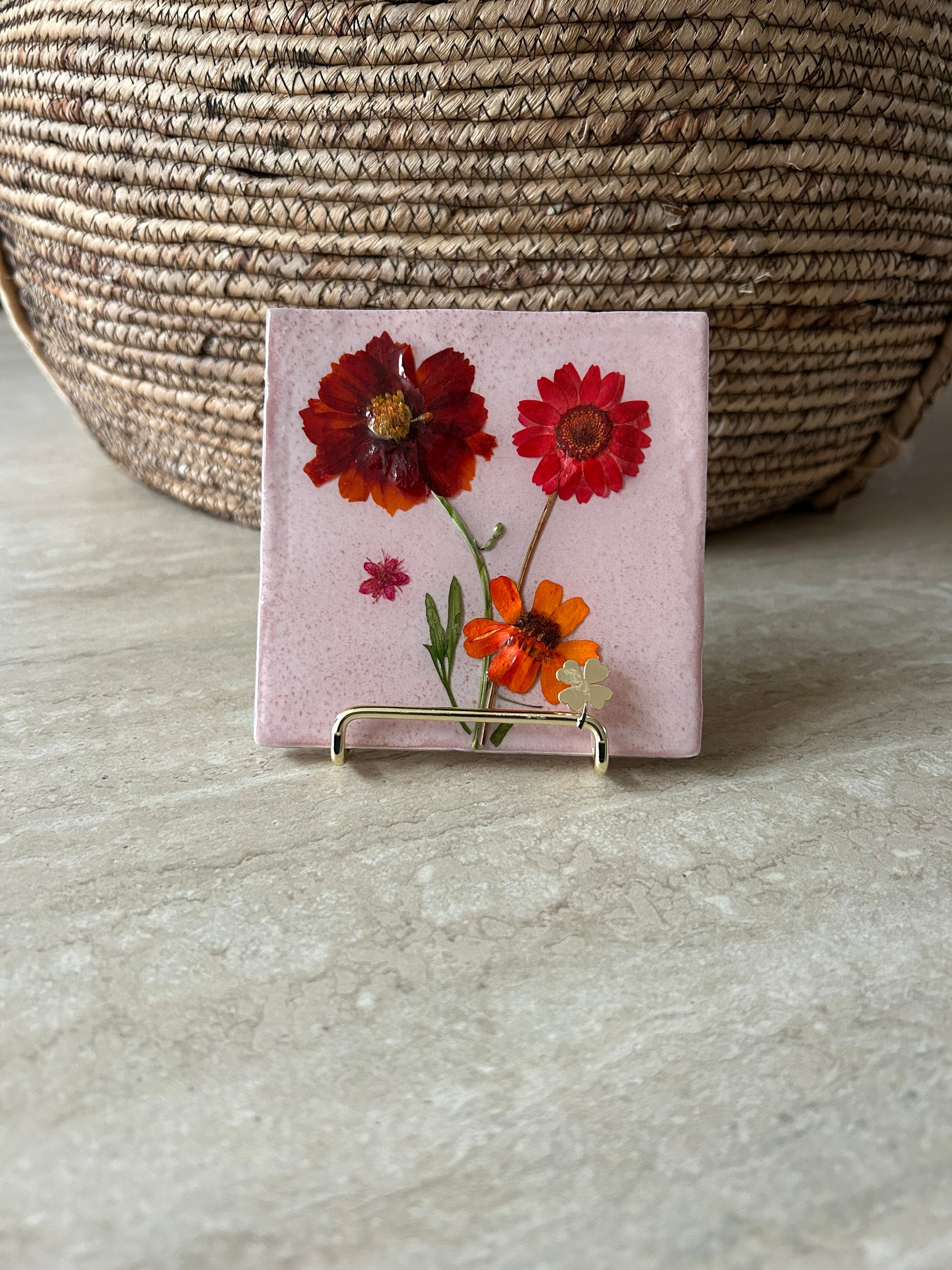 Handgemaakte tegel met echte droogbloemen. Elke tegel is uniek! Super leuk om neer te zetten of op te hangen in huis. Perfect om cadeau te doen.