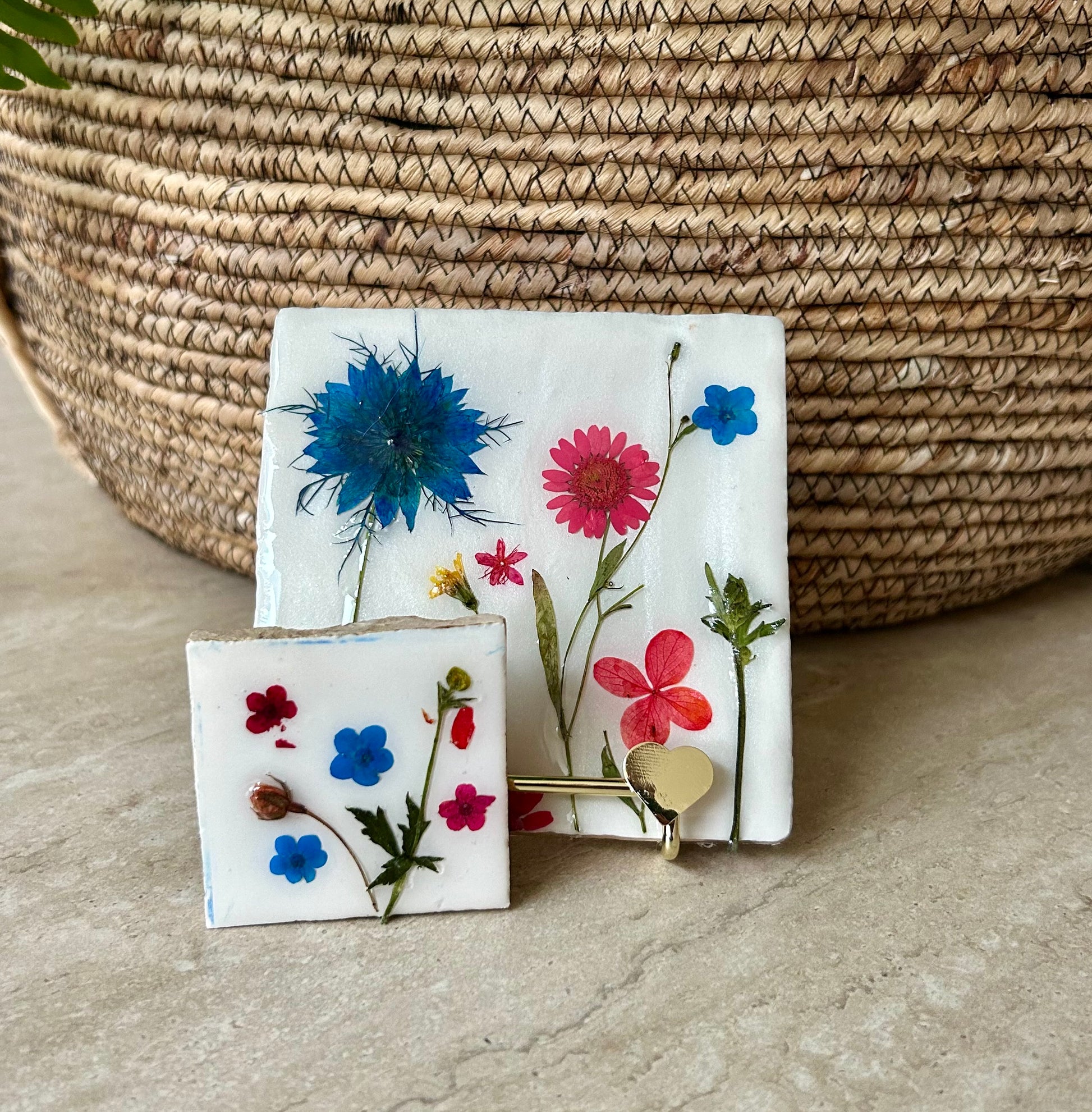 Handgemaakte tegel met echte droogbloemen. Elke tegel is uniek! Super leuk om neer te zetten of op te hangen in huis. Perfect om cadeau te doen.