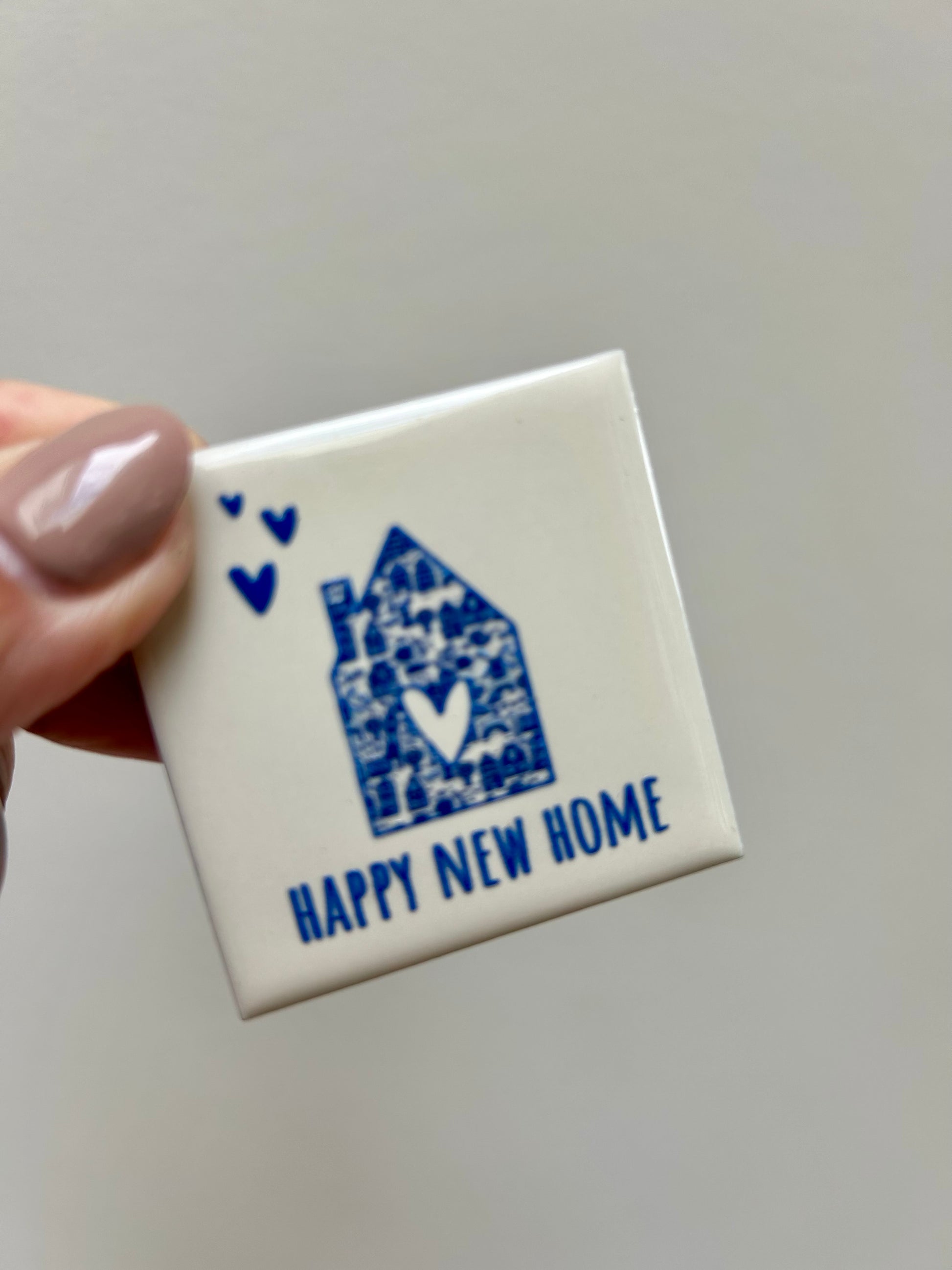 - Design: beige met Delfts blauw huisje, hart en de tekst Happy New Home