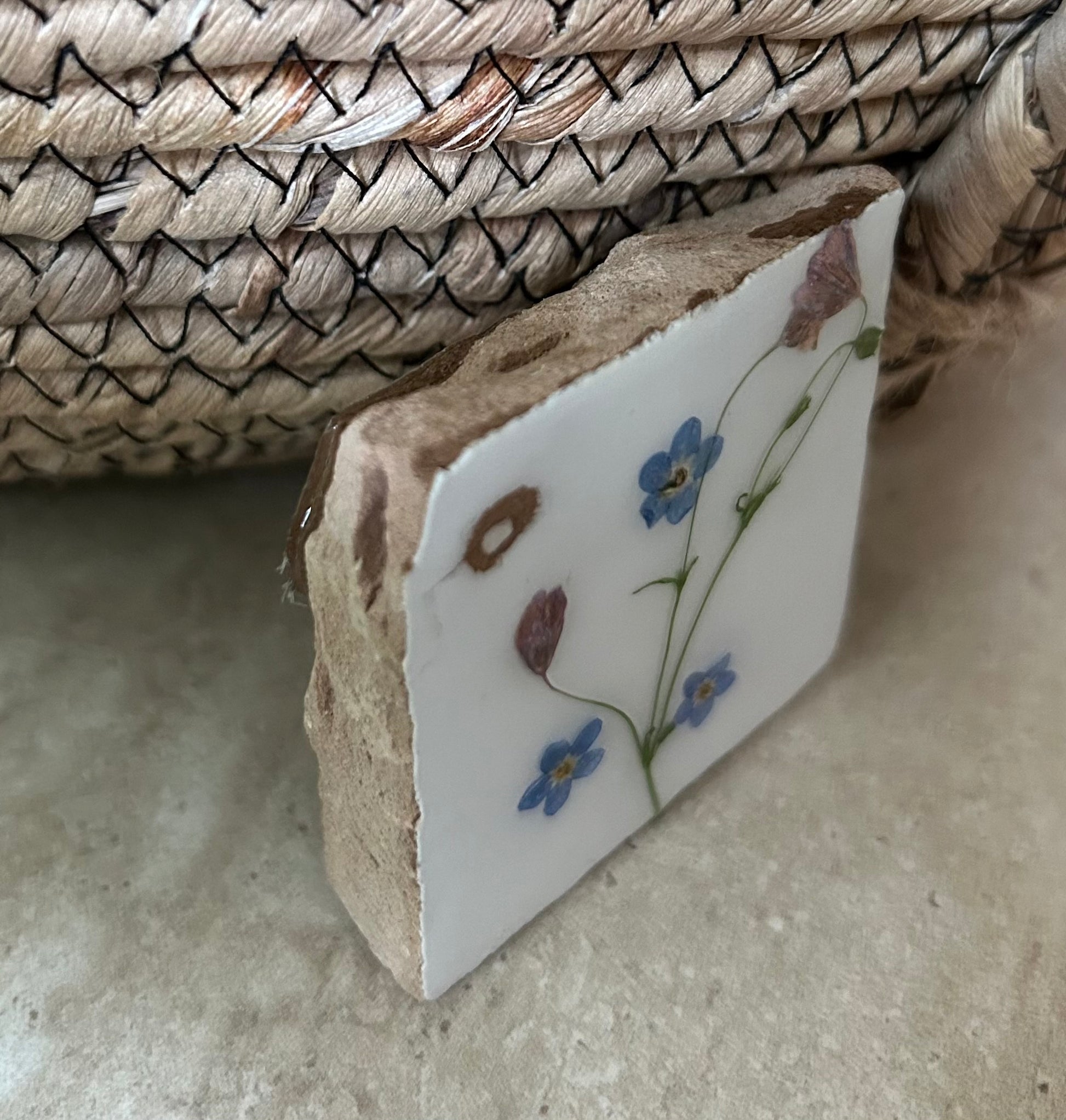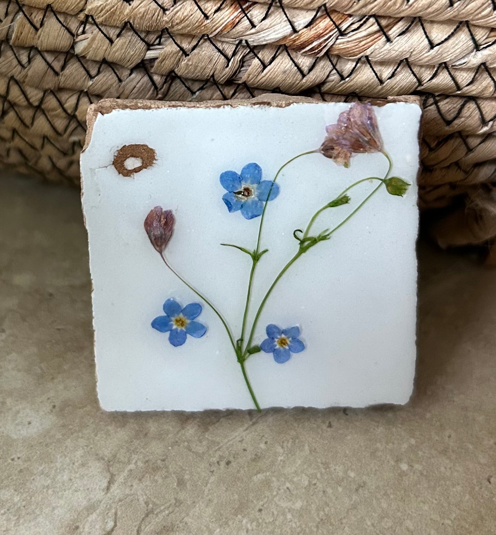 Handgemaakte tegel met echte droogbloemen. Elke tegel is uniek! Super leuk om neer te zetten of op te hangen in huis. Perfect om cadeau te doen. Kleur tegel: wit met vergeet me nietjes Afmeting: 5x5 cm Let op! Het gaat hier om een handgemaakt product met echte bloemen, daarom kunnen kleuren afwijken van de foto.