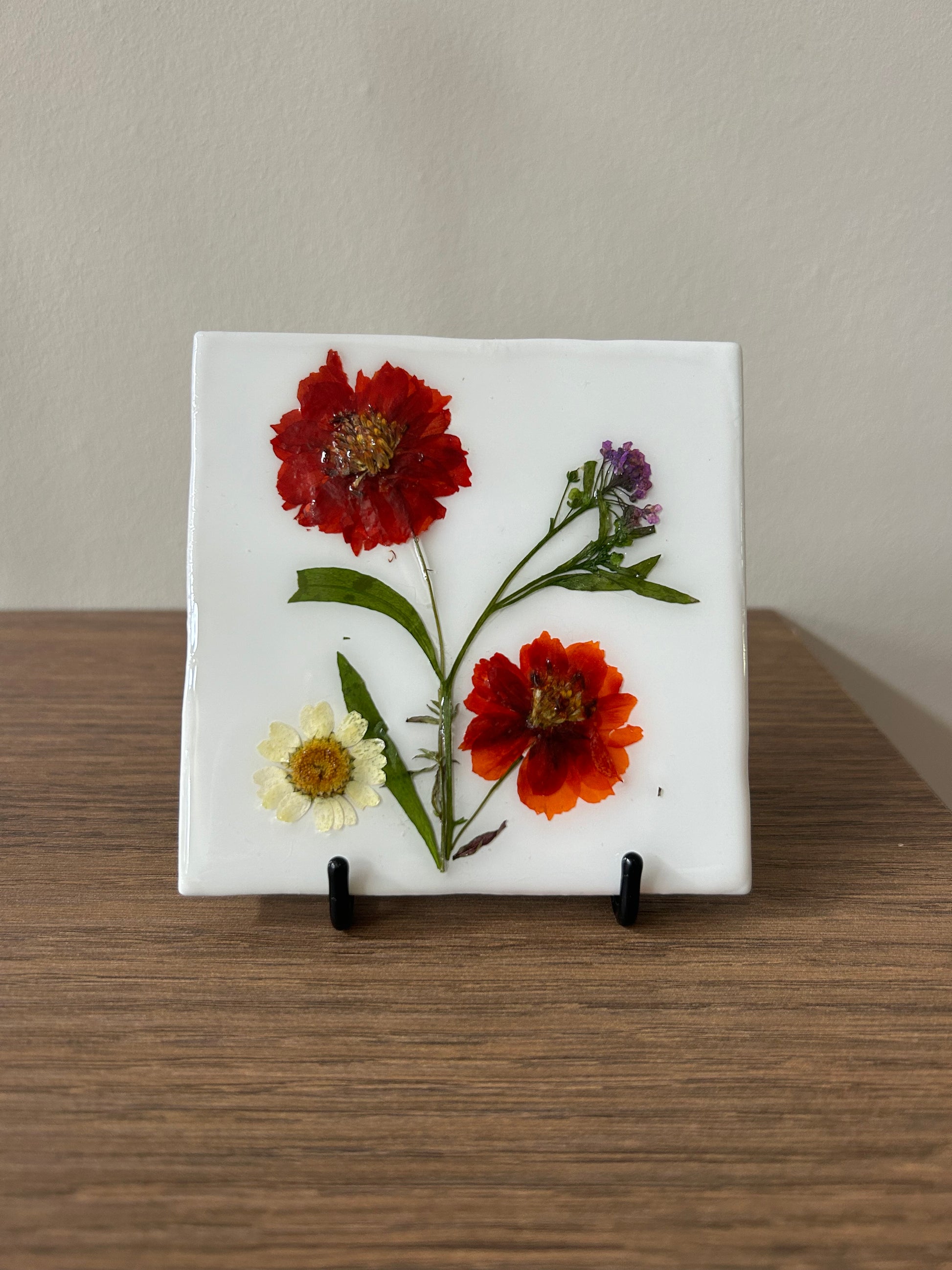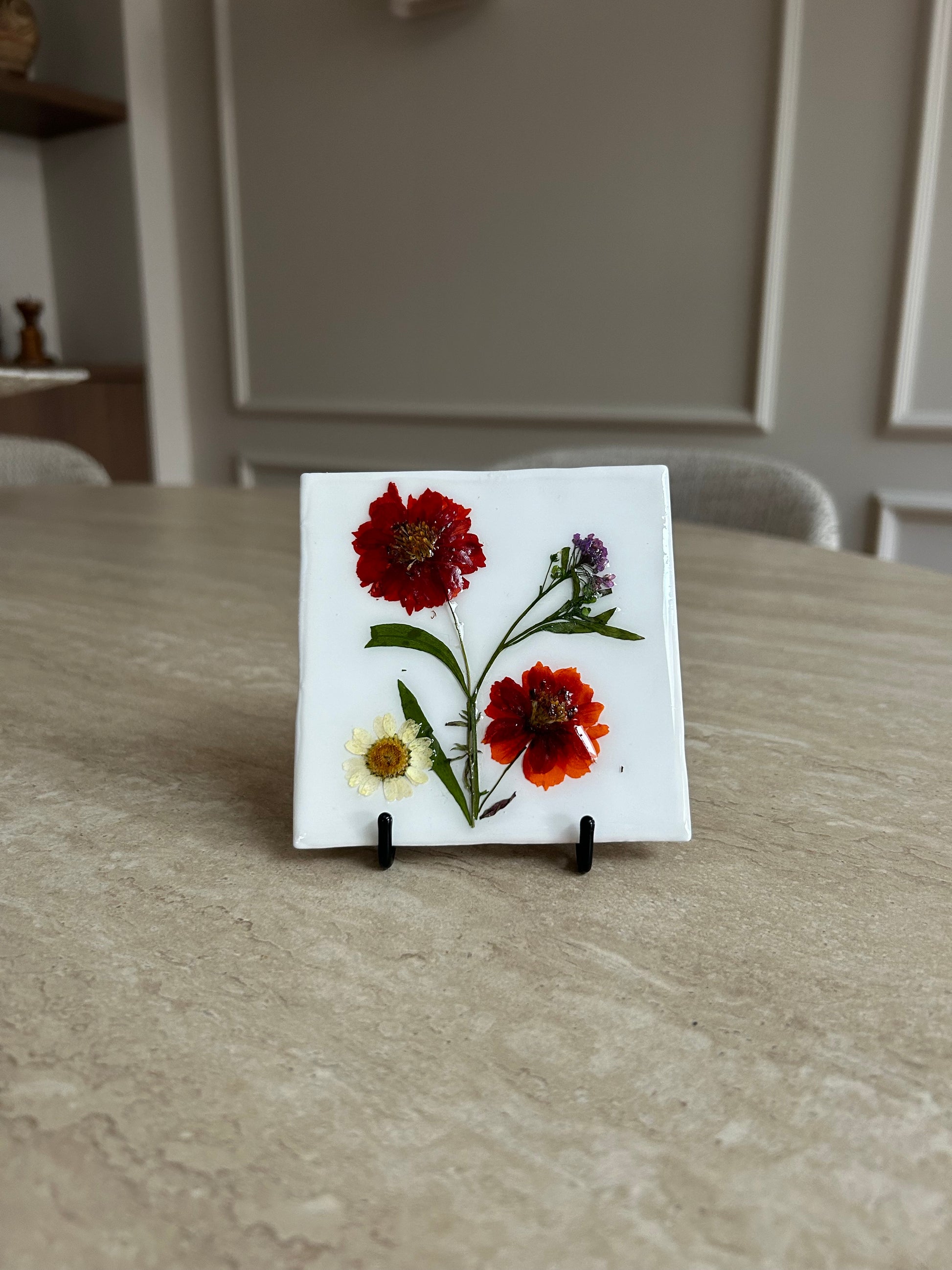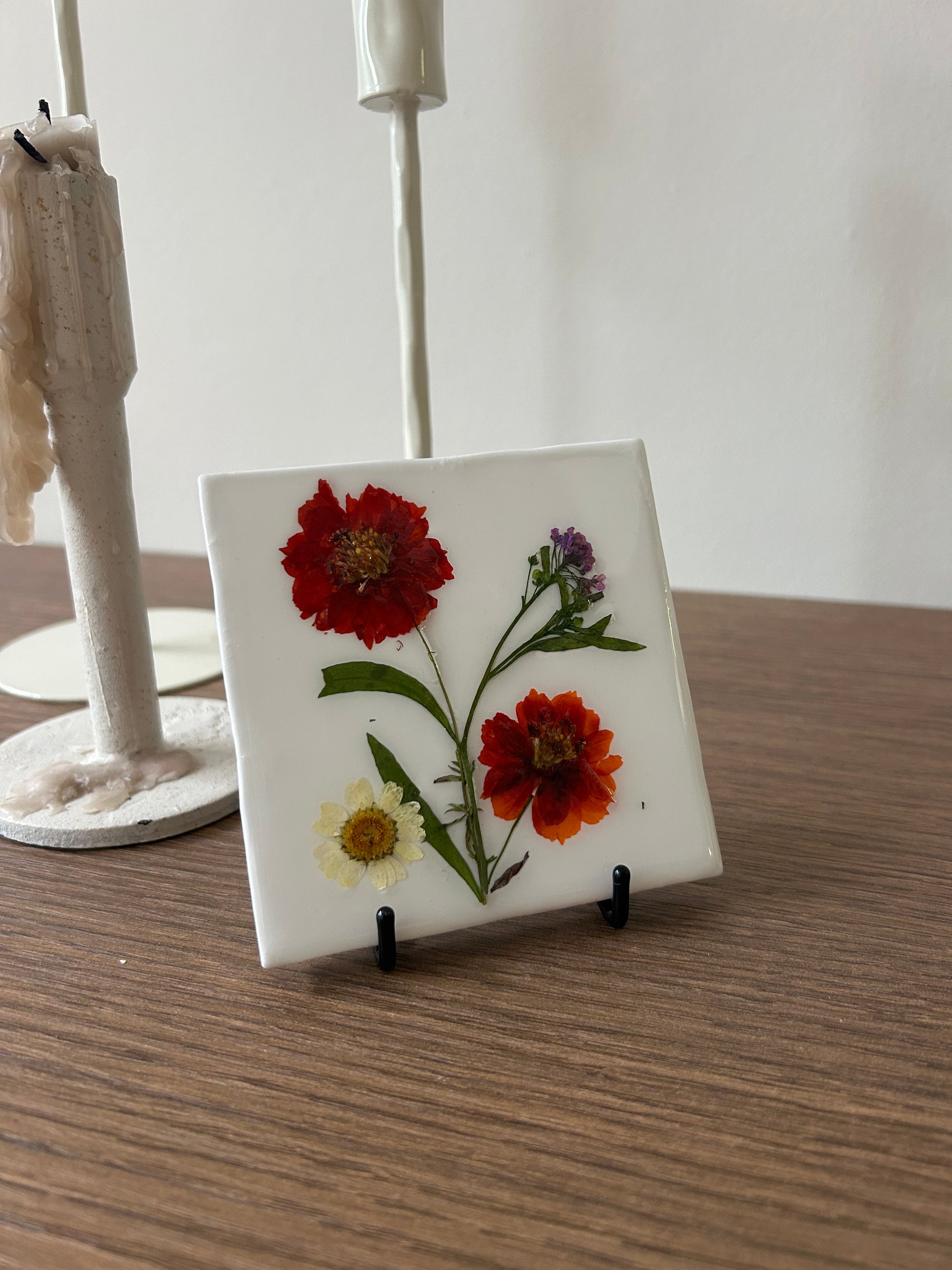 Handgemaakte tegel met echte droogbloemen. Elke tegel is uniek! Super leuk om neer te zetten of op te hangen in huis. Perfect om cadeau te doen. Kleur tegel: Wit Afmeting: 10x10cm Let op! Het gaat hier om een handgemaakt product met echte bloemen, daarom kunnen kleuren afwijken van de foto.